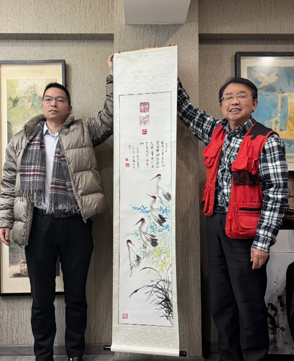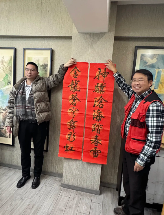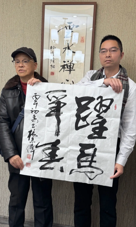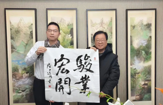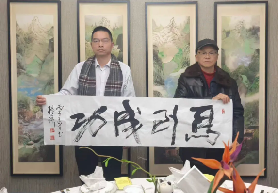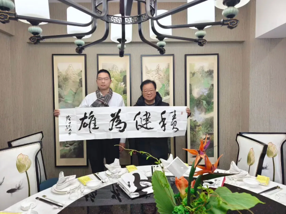 杨志伟、陆建如、黄志毅、武强林四位老师现场分别向朱鹏源馈赠了其书画作品与新年台历。